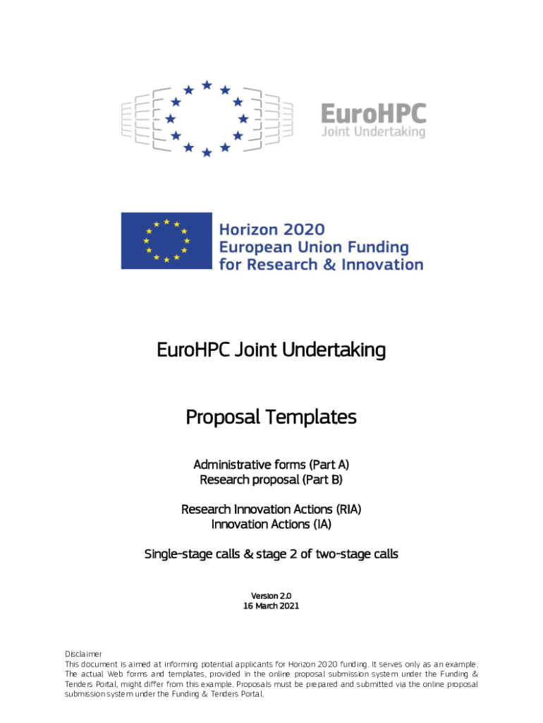 Euro HPC Joint Undertaking Proposal Templates Administrative forms (Part A) Research proposal (Part B) Research Innovation Actions (RIA) Innovation Actions (IA) Single stage calls & stage 2 of two