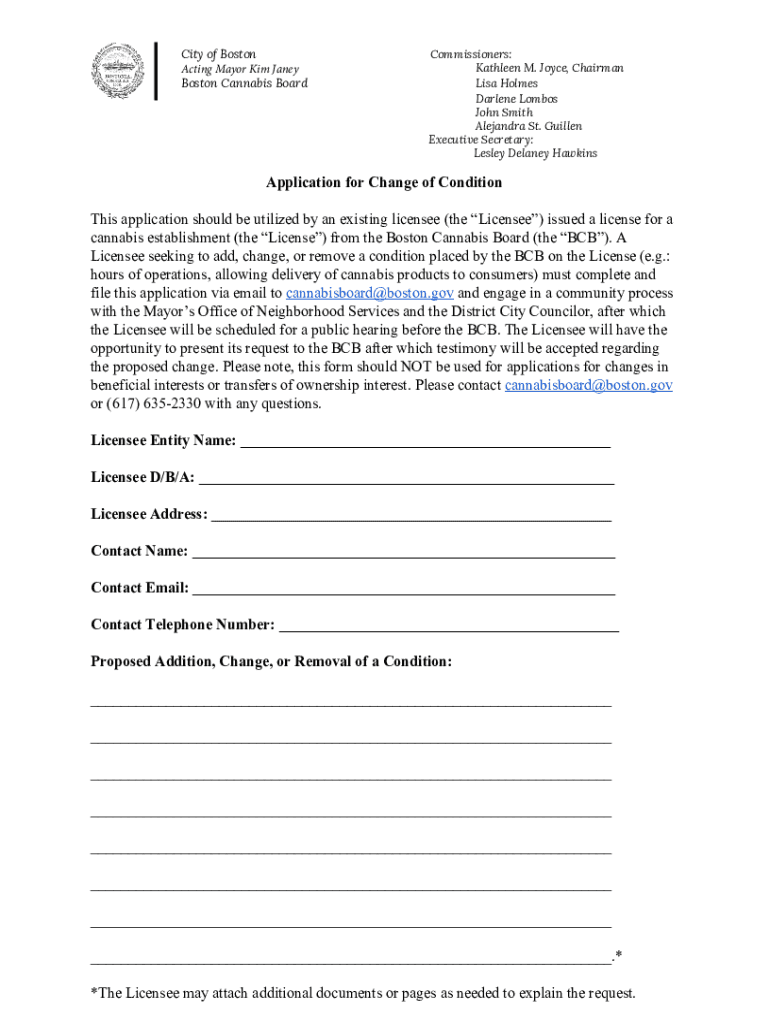 City of Boston Acting Mayor Kim Jana Boston Cannabis BoardCommissioners: Kathleen M. Joyce, Chairman Lisa Holmes Darlene Combos John Smith Alejandra St. Guille Executive Secretary: Lesley Delaney