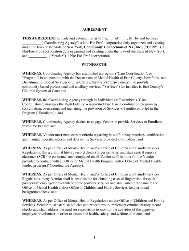 AGREEMENT THIS AGREEMENT is made and entered into as of the, of, 20 by and between (Coordinating Agency) a NotForProfit corporation duly organized and existing under the laws of the State of New York,