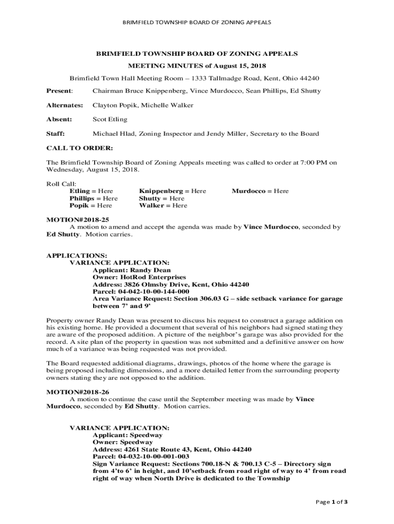 BROOMFIELD TOWNSHIP BOARD OF ZONING APPEALSBRIMFIELD TOWNSHIP BOARD OF ZONING APPEALS MEETING MINUTES of August 15, 2018, Brim field Town Hall Meeting Room 1333 Talmadge Road, Kent, Ohio 44240 Present:Chairman