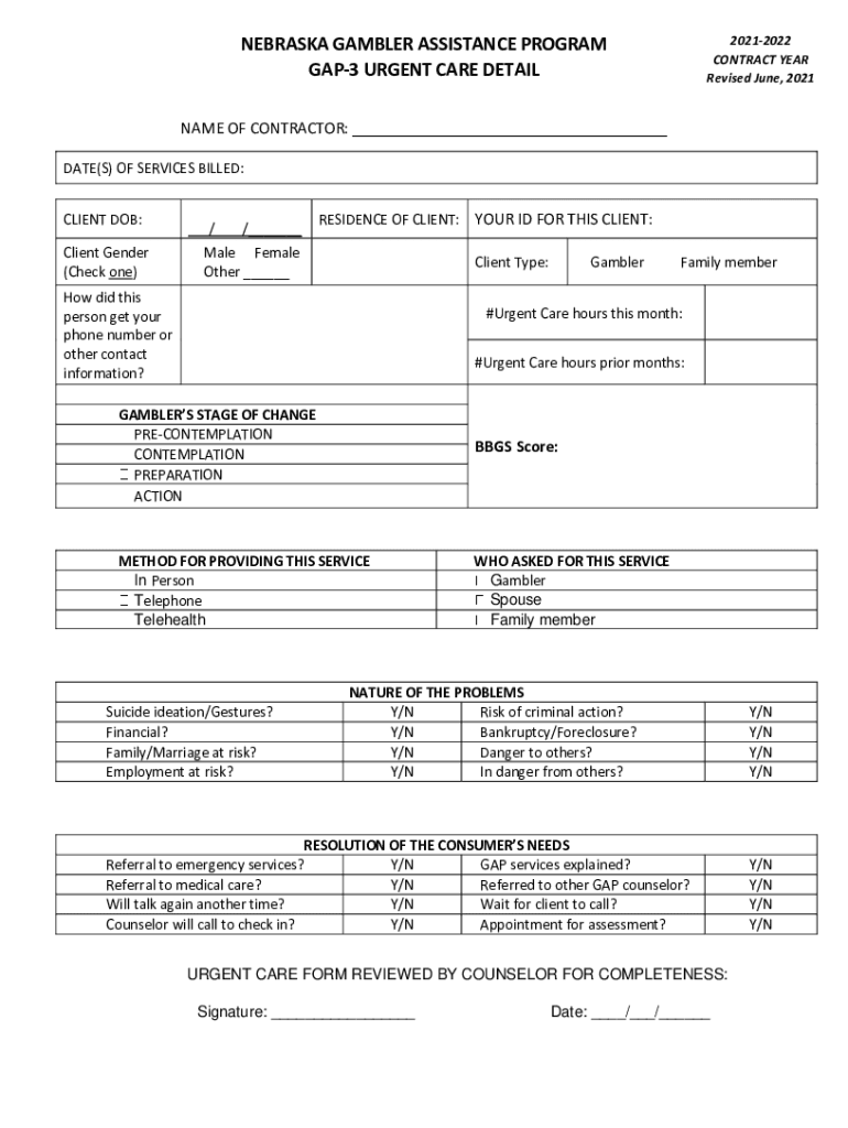 20212022 CONTRACT YEAR Revised June, 2021NEBRASKA GAMBLER ASSISTANCE PROGRAM GAP3 URGENT CARE DETAIL NAME OF CONTRACTOR: DATE(S) OF SERVICES BILLED: CLIENT DOB: Client Gender (Check one)// RESIDENCE