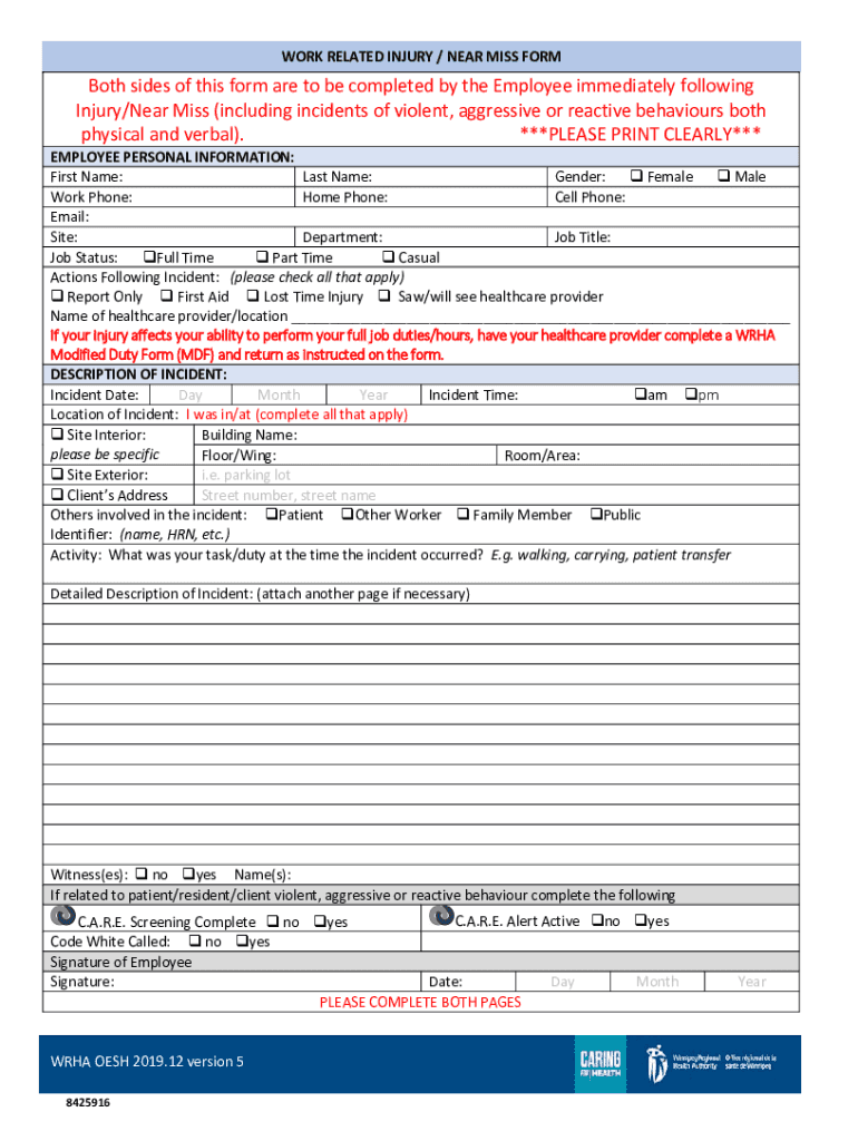 WORK RELATED INJURY / NEAR MISS Forsooth sides of this form are to be completed by the Employee immediately following Injury/Near Miss (including incidents of violent, aggressive or reactive behaviors