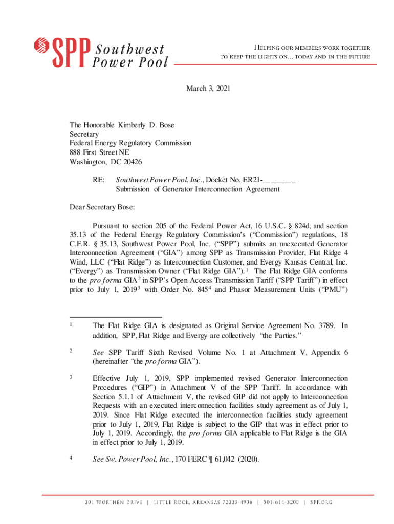 March 3, 2021The Honorable Kimberly D. Bose Secretary Federal Energy Regulatory Commission 888 First Street NE Washington, DC 20426 RE:Southwest Power Pool, Inc., Docket No. ER21 Submission of Generator