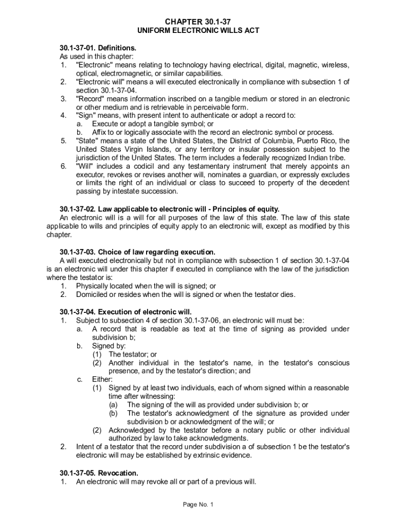 CHAPTER 30.137 UNIFORM ELECTRONIC WILLS ACT 30.13701. Definitions. As used in this chapter: 1. Electronic means relating to technology having electrical, digital, magnetic, wireless, optical, electromagnetic,