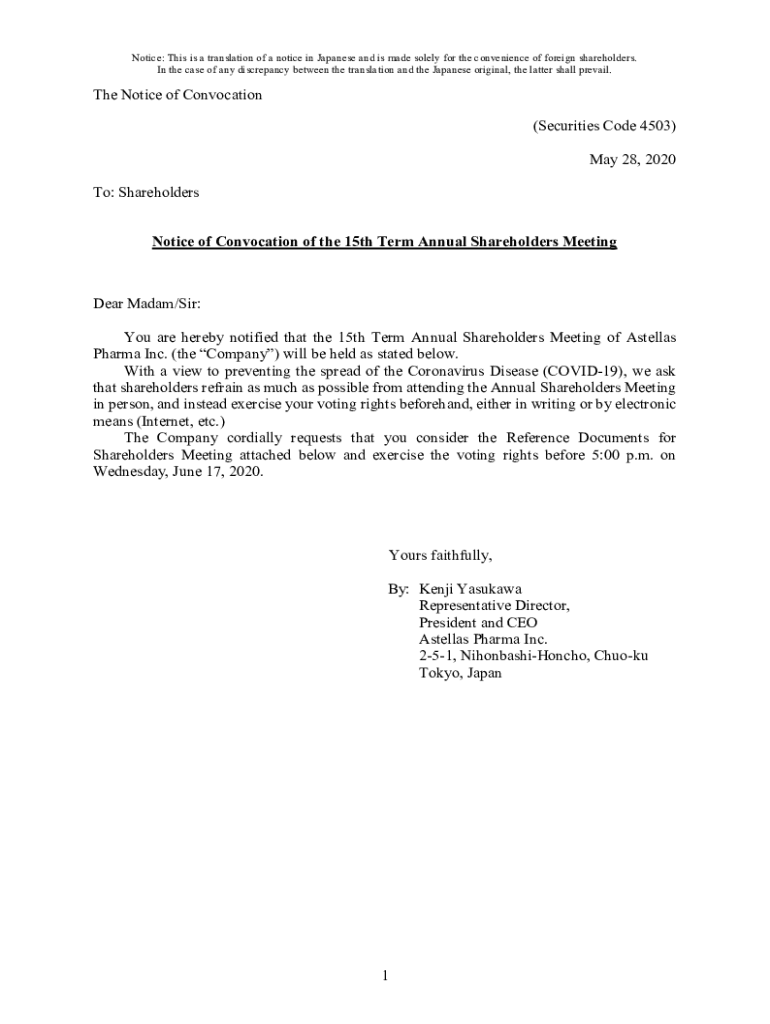 Notice: This is a translation of a notice in Japanese and is made solely for the convenience of foreign shareholders. In the case of any discrepancy between the translation and the Japanese original,