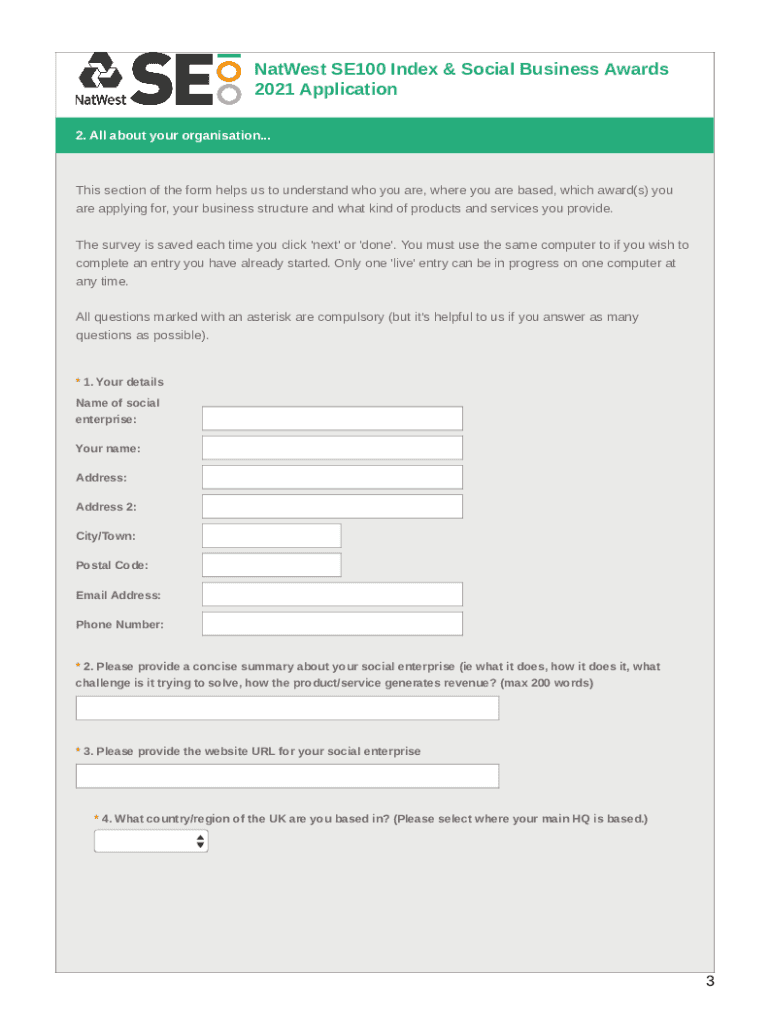 Nat West SE100 Index & Social Business Awards 2021 Application 1. WelcomeThank you for your interest in becoming a Top 100 UK social enterprise! Pioneers Post & Nat West SCC The Nat West SE100 & Social