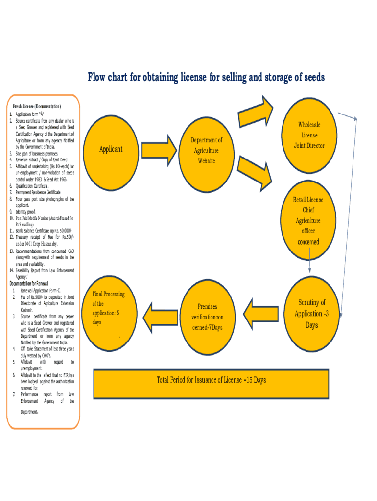 Flow chart for obtaining license for selling and storage of seeds Fresh License (Documentation) 1. 2.3. 4. 5. 6. 7. 8. 9. 10. 11. 12. 13. 14. Application form Source certificate from any dealer who