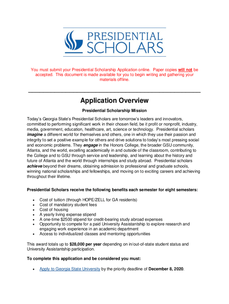 You must submit your Presidential Scholarship Application online. Paper copies will not be accepted. This document is made available for you to begin writing and gathering your materials offline.
