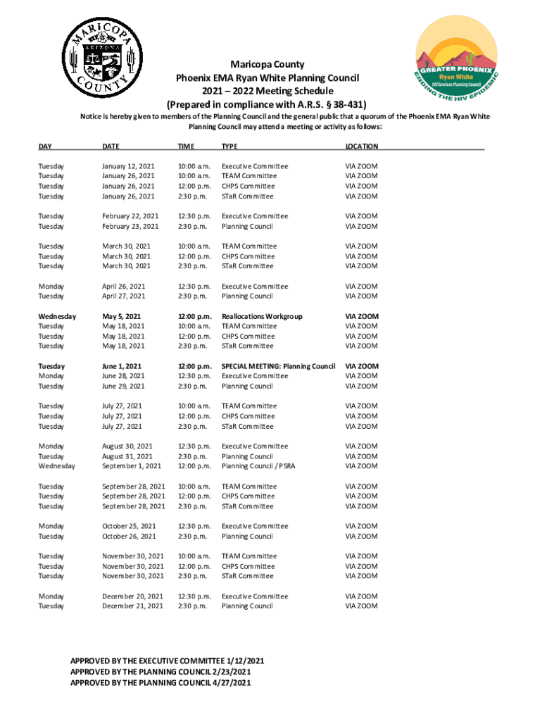 MaricopaCounty PhoenixEMARyanWhitePlanningCouncil 20212022MeetingSchedule (PreparedincompliancewithA. R.S.38431) NoticeisherebygiventomembersofthePlanningCouncilandthegeneralpublicthataquorumofthePhoenixEMARyanWhite
