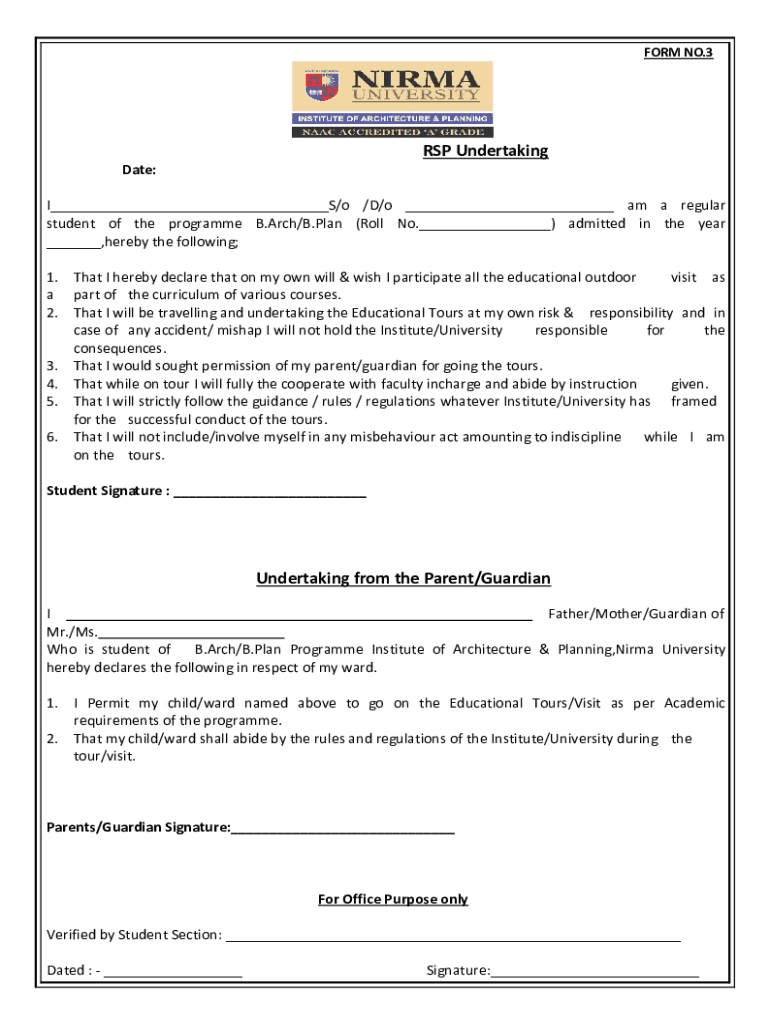 FORM NO.3RSP UndertakingDate:I S/o /D/o am a regular student of the program B.Arch./B. Plan (Roll No. ) admitted in the year, hereby the following; 1. That I hereby declare that on my own will & wish