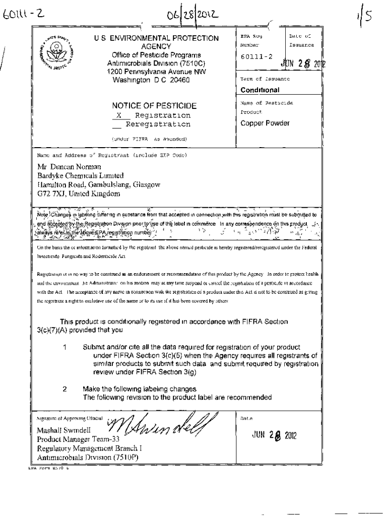 2,5 U S ENVIRONMENTAL PROTECTION AGENCY Office of Pesticide Programs Antimicrobial Division (751OC) 1200 Pennsylvania Avenue NW Washington D C 20460EPA Regulate ofNumberIssuance6011124)N 2 8 20Term