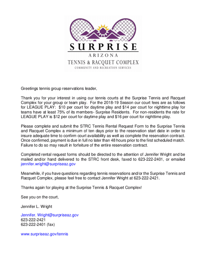 Greetings tennis group reservations leader, Thank you for your interest in using our tennis courts at the Surprise Tennis and Racquet Complex for your group or team play. For the 201819 Season our