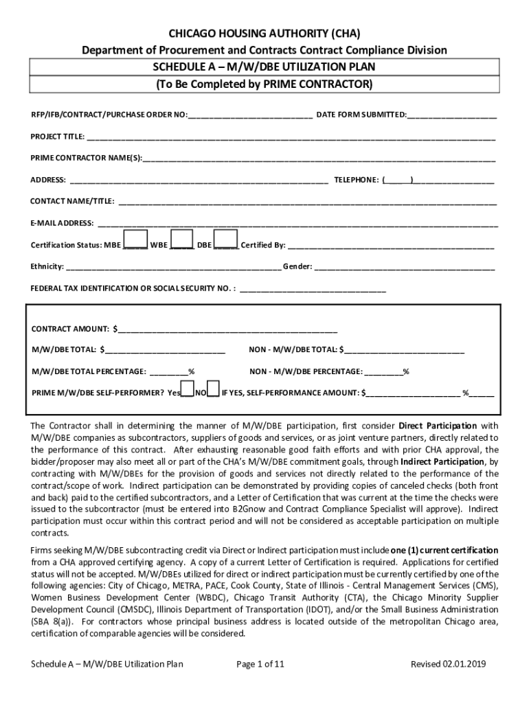 CHICAGO HOUSING AUTHORITY (CIA) Department of Procurement and Contracts Contract Compliance Division SCHEDULE A M/W/BE UTILIZATION PLAN (To Be Completed by PRIME CONTRACTOR) RFP/IF/CONTRACT/PURCHASE