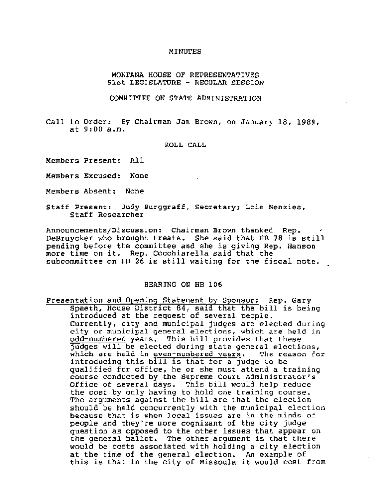 MINUTES MONTANA HOUSE OF REPRESENTATIVES 51st LEGISLATURE REGULAR SESSION COMMITTEE ON STATE ADMINISTRATION Call to Order: By Chairman Jan Brown, on January 18, 1989, at 9:00 a.m. ROLL CALL Members