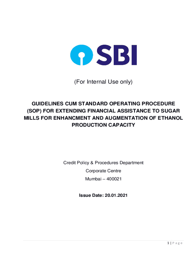 (For Internal Use only)GUIDELINES Come STANDARD OPERATING PROCEDURE (SOP) FOR EXTENDING FINANCIAL ASSISTANCE TO SUGAR MILLS FOR ENHANCEMENT AND AUGMENTATION OF ETHANOL PRODUCTION CAPACITYCredit Policy