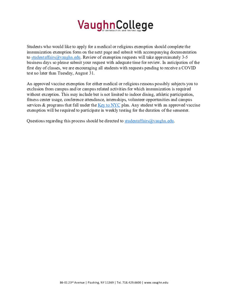 Students who would like to apply for a medical or religious exemption should complete the immunization exemption form on the next page and submit with accompanying documentation to studentaffairs@vaughn.edu.