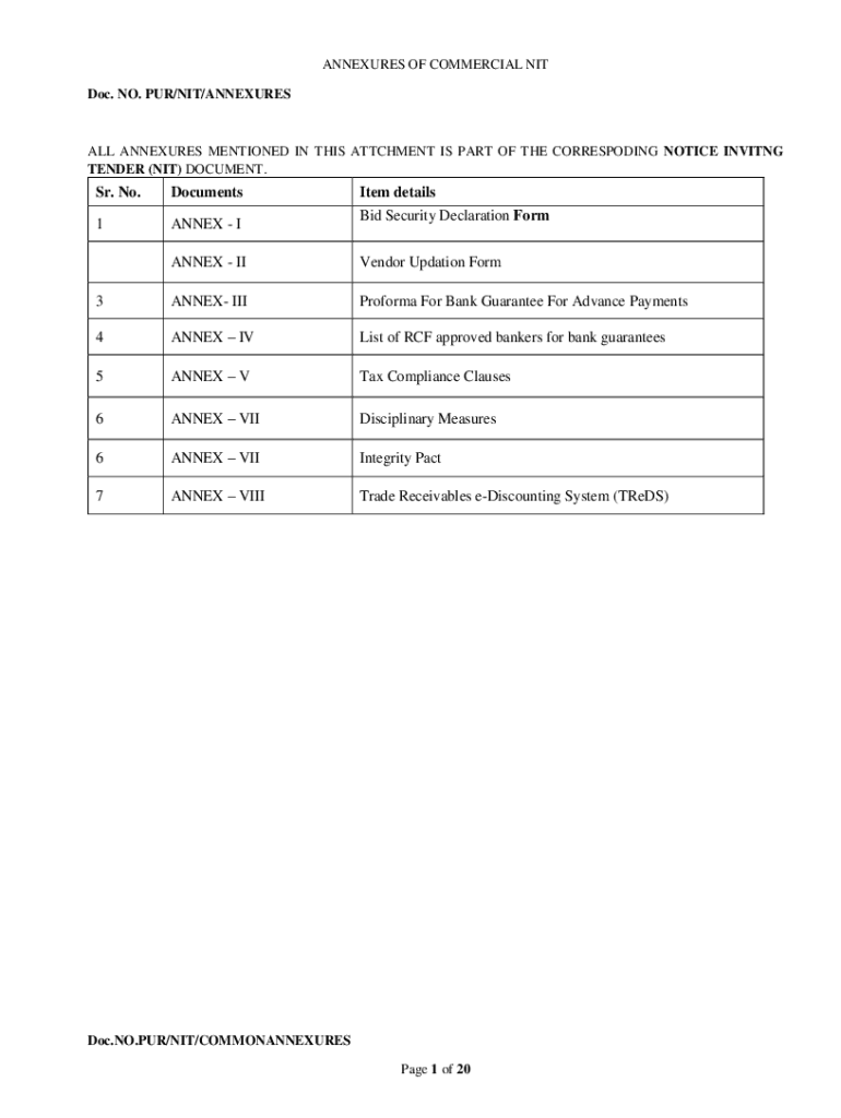 Appendixes OF COMMERCIAL NIT Doc. NO. PUR/NIT/ANNEXURESALL Appendixes MENTIONED IN THIS ATTACHMENT IS PART OF THE CORRESPONDING NOTICE INVITING TENDER (NIT) DOCUMENT. Sr. No. Documents1ANNEX Item