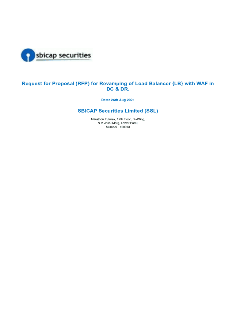 Request for Proposal (RFP) for Revamping of Load Balancer LB with WAS in DC & DR. Date: 26th Aug 2021SBICAP Securities Limited (SSL) Marathon Future, 12th Floor, B Wing, N M Joshi Mary, Lower Pearl,