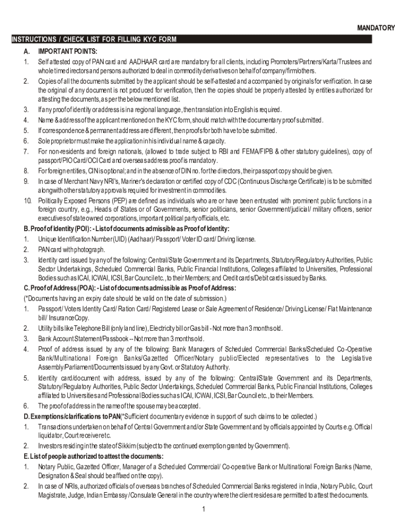 12 3 4 5 6 7 8 9 0 1 2 3 4 5 6 7 8 9 0 1 2 3 4 5 6 7 8 9 0 1 2 3 4 5 6 7 8 9 0 1 2 3 4 5 6 7MANDATORY INSTRUCTIONS / CHECK LIST FOR FILLING KYC FORM A. 1.IMPORTANT POINTS: Self attested copy of PAN