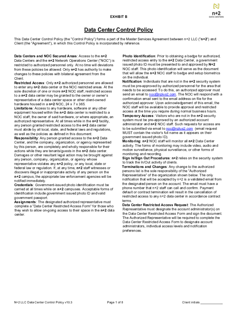 EXHIBIT Data Center Control Policy This Data Center Control Policy (the Control Policy) forms a part of the Master Services Agreement between n+2 LLC (n+2) and Client (the Agreement), in which this