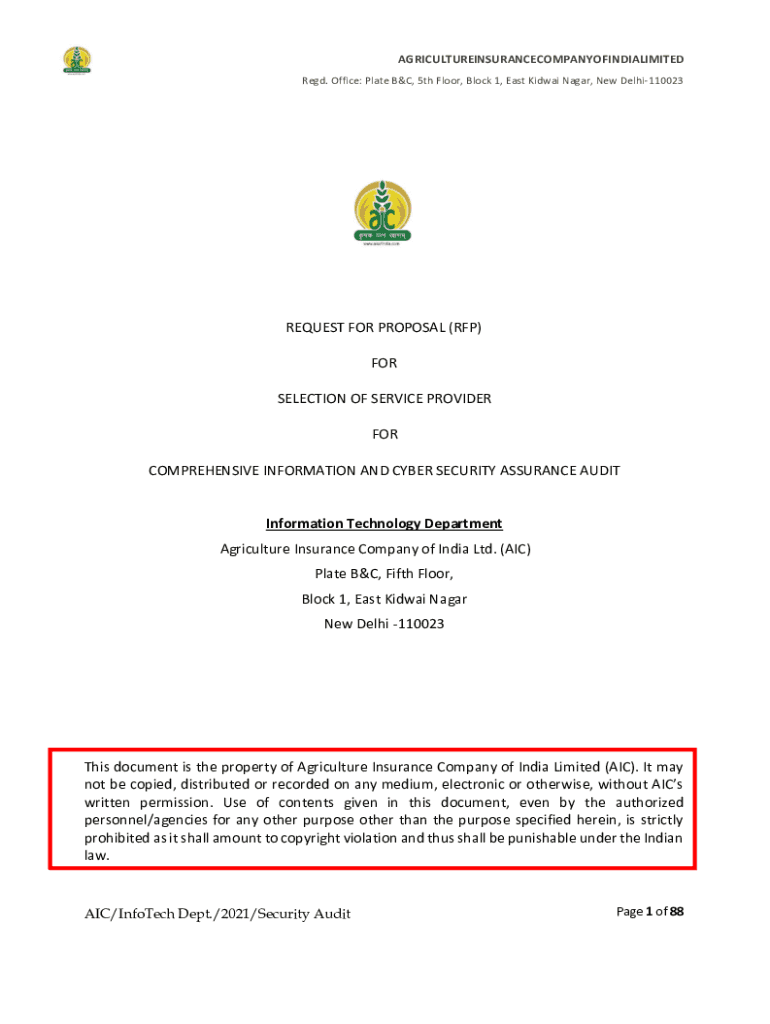 AGRICULTUREINSURANCECOMPANYOFINDIALIMITED Red. Office: Plate B&C, 5th Floor, Block 1, East Kiddie Nagar, New Delhi110023REQUEST FOR PROPOSAL (RFP) FOR SELECTION OF SERVICE PROVIDER FOR COMPREHENSIVE