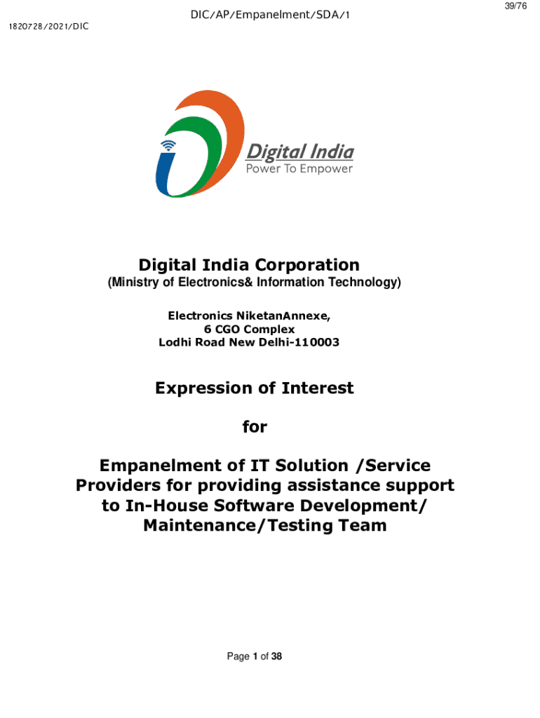 1820728/2021/DIC/AP/Embankment/SDA/1Digital India Corporation (Ministry of Electronics Information Technology) Electronics NiketanAnnexe, 6 CGO Complex Lodi Road New Delhi110003Expression of Interest
