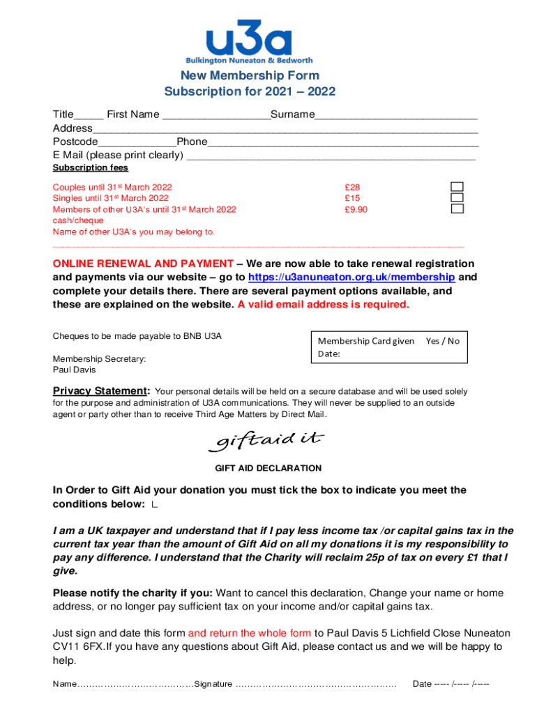 New Membership Form Subscription for 2021 2022 Title First Name Surname Address Postcode Phone E Mail (please print clearly) Subscription fees Couples until 31st March 2022 28 st Singles until 31
