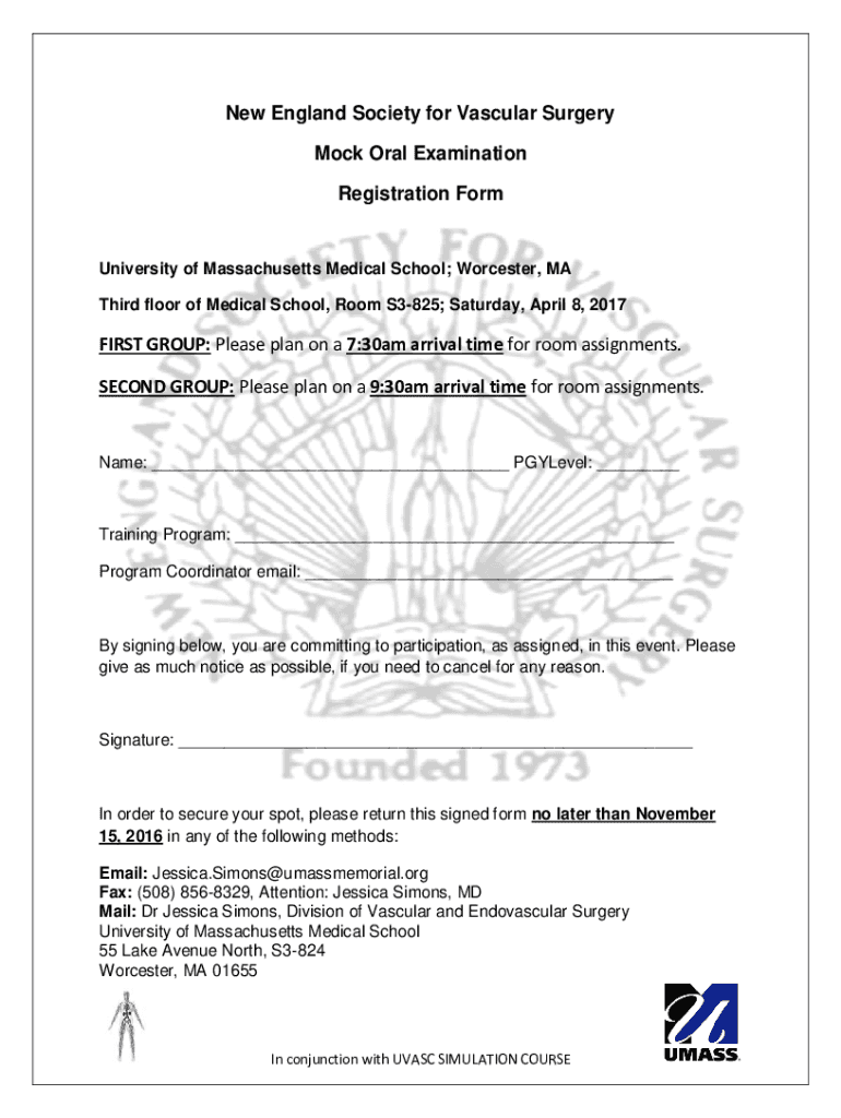 New England Society for Vascular Surgery Mock Oral Examination Registration Preuniversity of Massachusetts Medical School; Worcester, MA Third floor of Medical School, Room S3825; Saturday, April