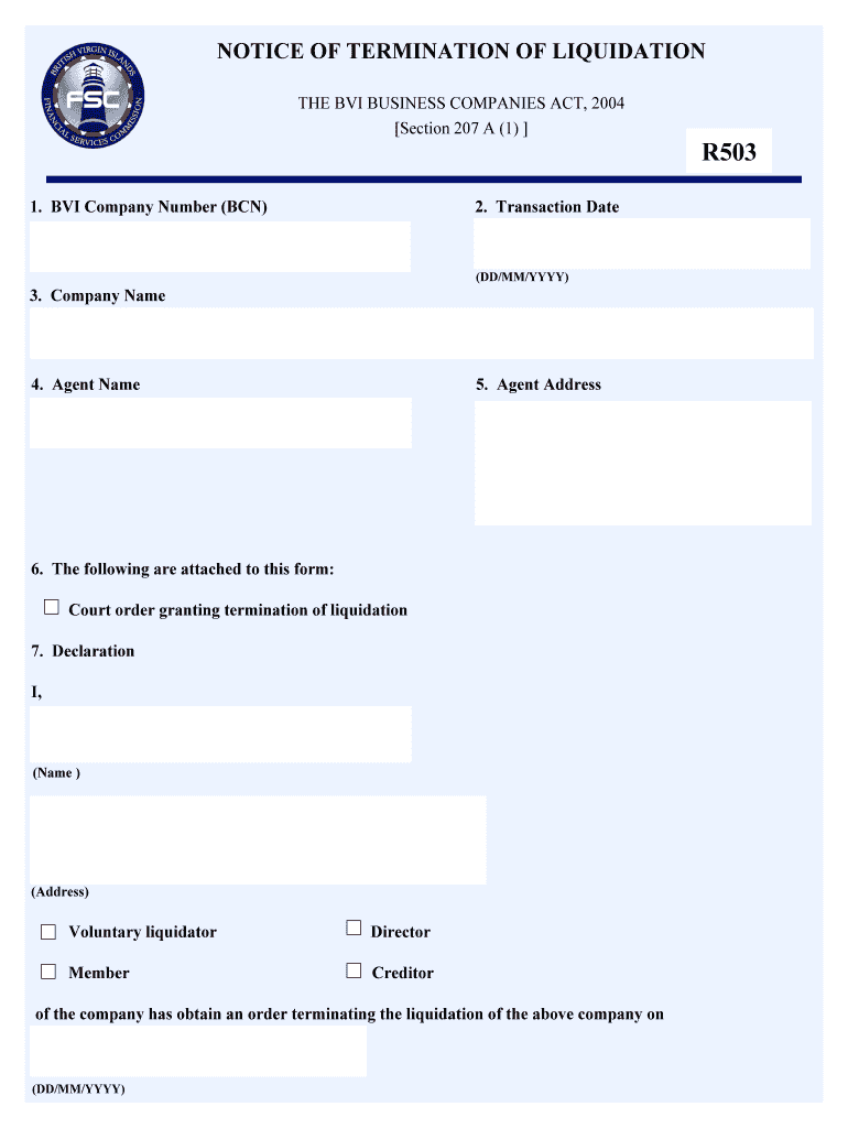 NOTICE OF TERMINATION OF LIQUIDATION THE BVI BUSINESS COMPANIES ACT, 2004 Section 207 A (1) 1. BVI Company Number (BCN) 2. Transaction Date (DD/MM/YYY) 3. Company Name 4. Agent Name 5. Agent Address