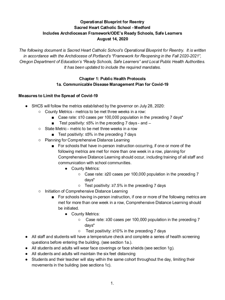 Operational Blueprint for Reentry Sacred Heart Catholic School Medford Includes Archdiocesan Framework/Odes Ready Schools, Safe Learners August 14, 2020, The following document is Sacred Heart Catholic