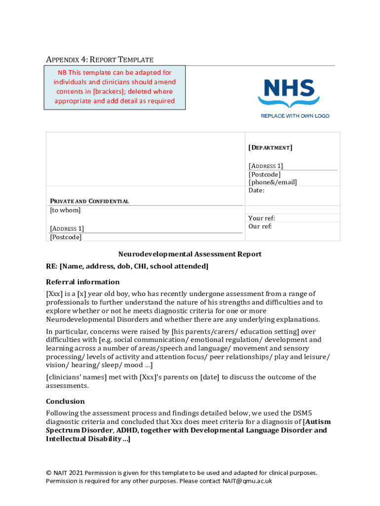 APPENDIX 4: REPORT TEMPLATE NB This template can be adapted for individuals and clinicians should amend contents in brackets ; deleted where appropriate and add detail as required DEPARTMENT ADDRESS