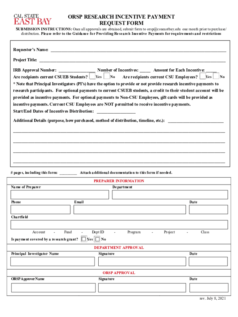 ORP RESEARCH INCENTIVE PAYMENT REQUEST PRESUBMISSION INSTRUCTIONS: Once all approvals are obtained, submit form to ORP csueastbay.edu one month prior to purchase/ distribution. Please refer to the