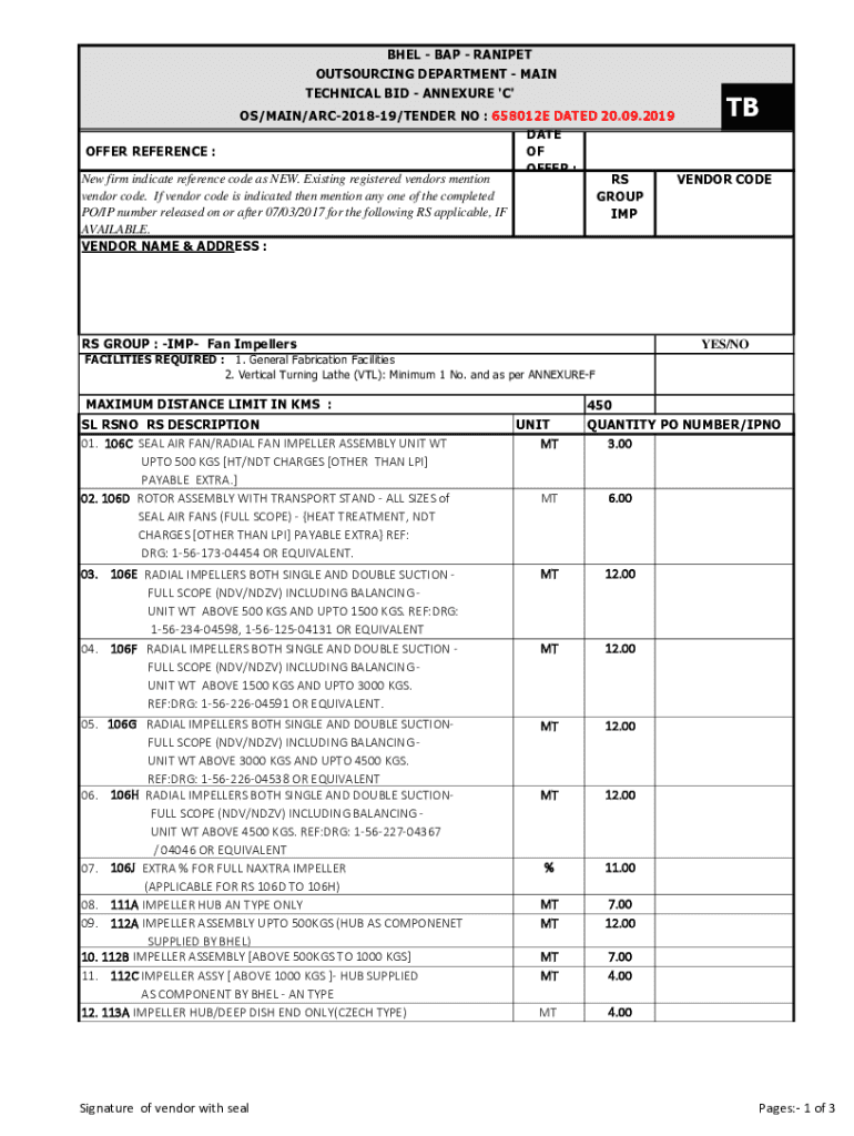 BAEL BAP RANGE OUTSOURCING DEPARTMENT MAIN TECHNICAL BID Appendix 'C 'TWOS/MAIN/ARC201819/TENDER NO : 658012E DATED 20.09.2019 DATE OFFER REFERENCE : OF OFFER : New firm indicate reference code as