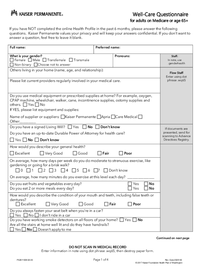Welfare Questionnaire for adults on Medicare or age 65+ If you have NOT completed the online Health Profile in the past 6 months, please answer the following questions. Kaiser Permanent values your