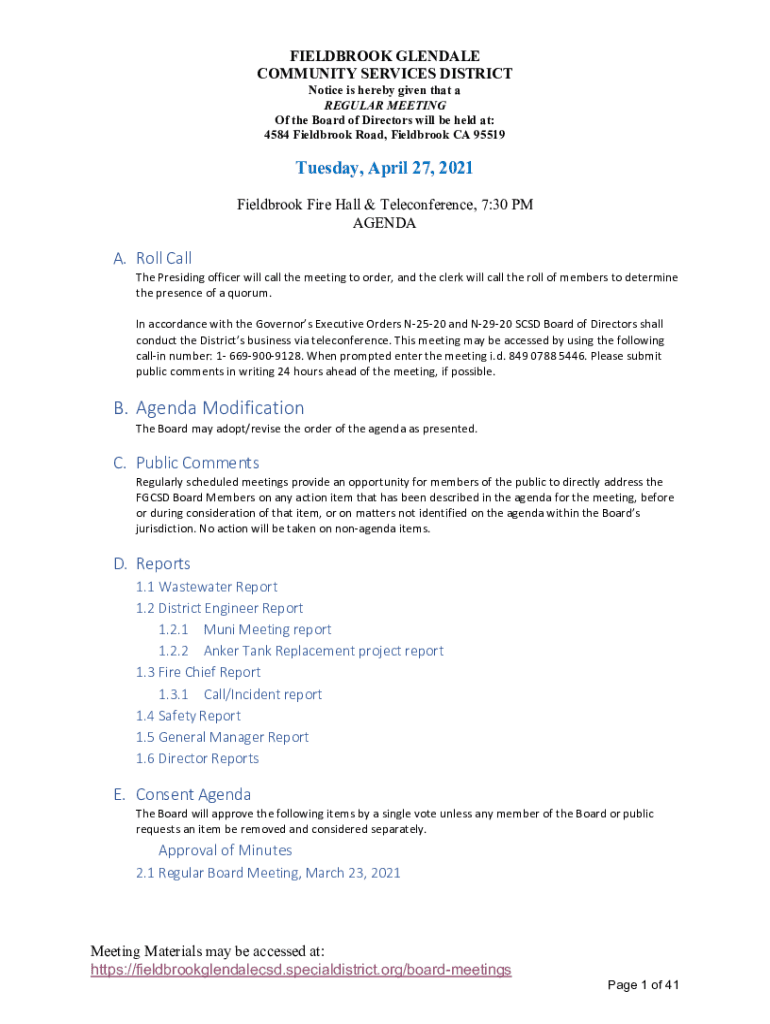 FIELDWORK GLENDALE COMMUNITY SERVICES DISTRICT Notice is hereby given that a REGULAR MEETING Of the Board of Directors will be held at: 4584 Field brook Road, Field brook CA 95519Tuesday, April 27,