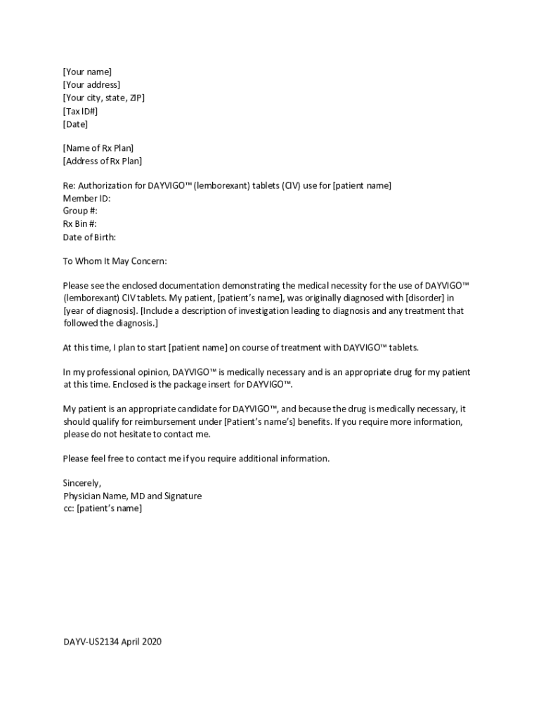 The Dayvigo Sample Letter of Medical Necessity must include details about the patient's medical history, diagnosis, treatment plan, and why Dayvigo is necessary for their care.