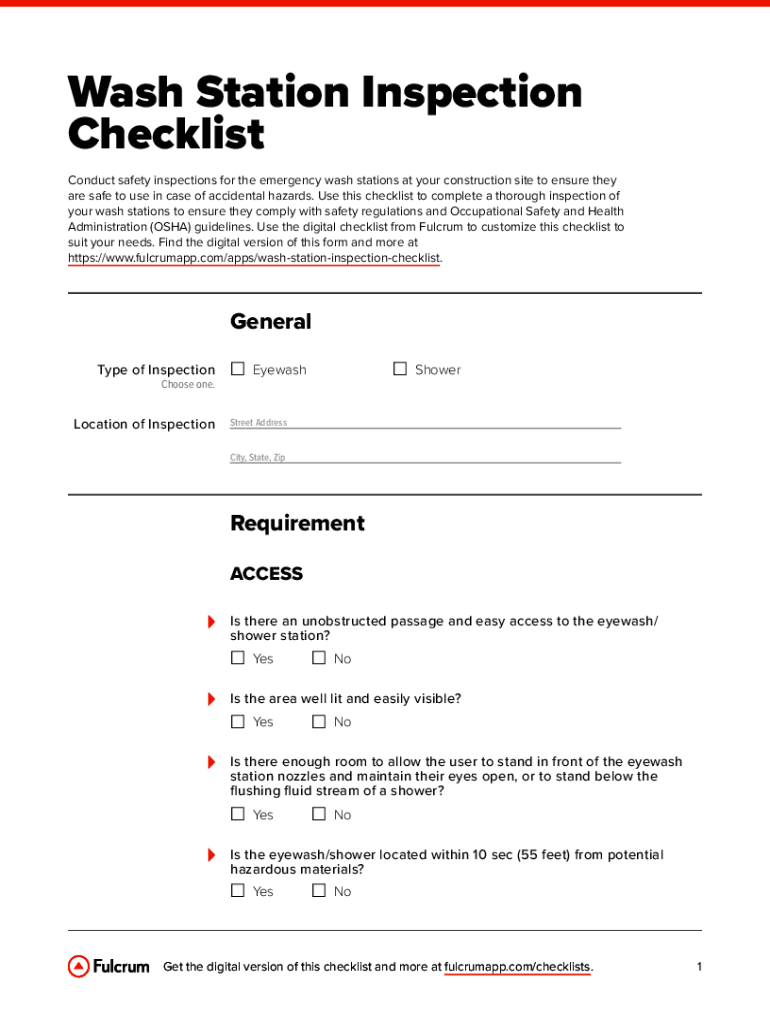 Wash Station Inspection Checklist Conduct safety inspections for the emergency wash stations at your construction site to ensure they are safe to use in case of accidental hazards. Use this checklist