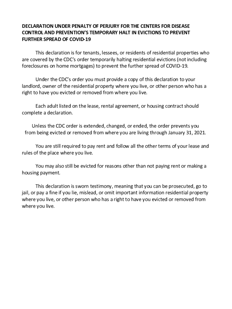 DECLARATION UNDER PENALTY OF PERJURY FOR THE CENTERS FOR DISEASE CONTROL AND PREVENTIONS TEMPORARY HALT IN EVICTIONS TO PREVENT FURTHER SPREAD OF COVID-19 This declaration is for tenants, lessees,