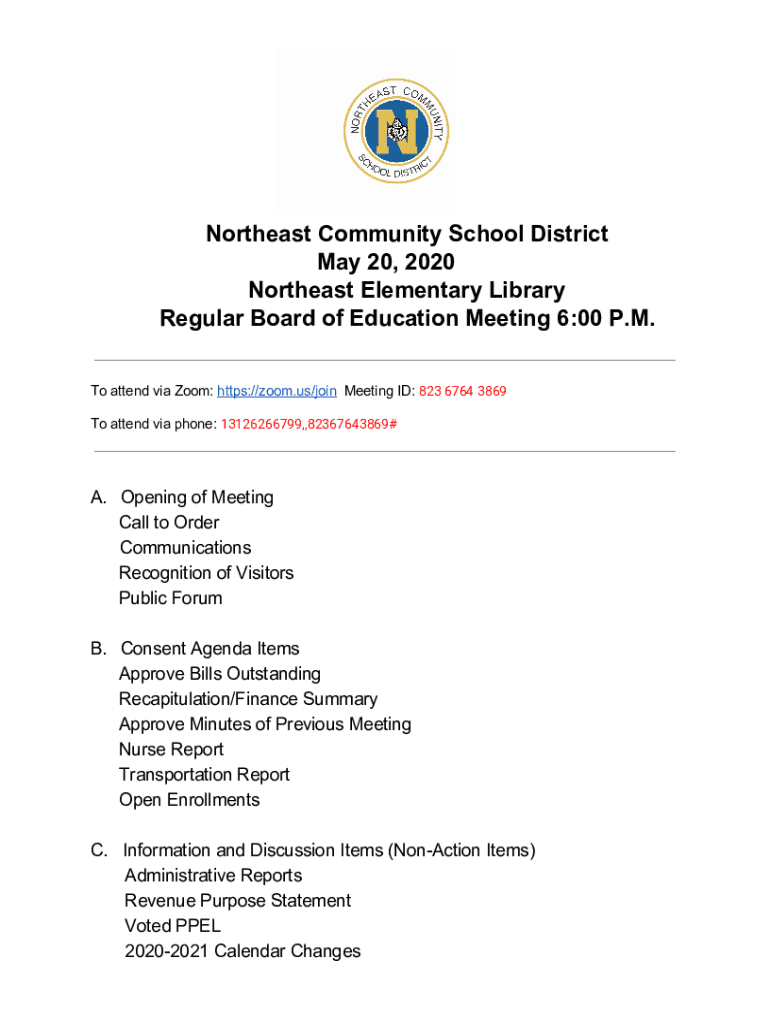 Northeast Community School District May 20, 2020, Northeast Elementary Library Regular Board of Education Meeting 6:00 P.M. To attend via Zoom: https://zoom.us/join Meeting ID: 823 6764 3869 To attend