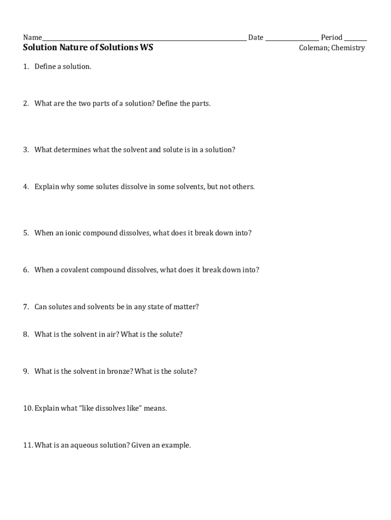 Name Date Period Solution Nature of Solutions WS Coleman; Chemistry 1. Define a solution.2. What are the two parts of a solution? Define the parts.3. What determines what the solvent and solute is