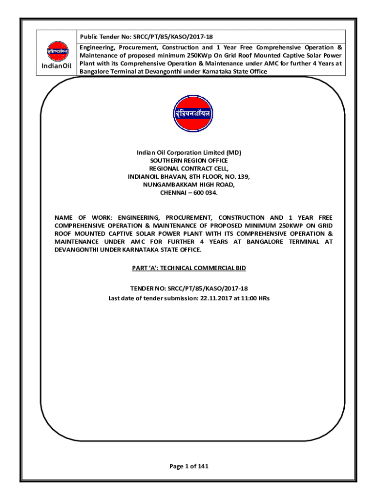 Public Tender No: SCC/PT/85/KARO/201718IndianOilEngineering, Procurement, Construction and 1 Year Free Comprehensive Operation & Maintenance of proposed minimum 250KWp On Grid Roof Mounted Captive