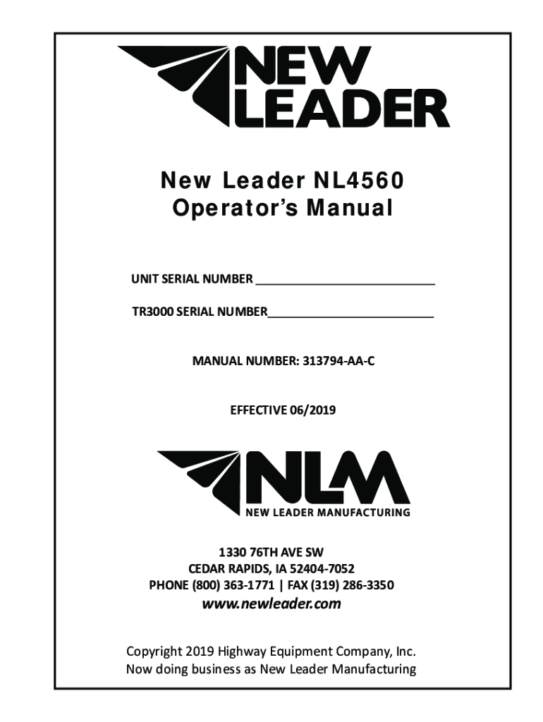 New Leader NL4560 Operators Manual UNIT SERIAL NUMBER TR3000 SERIAL NUMBER MANUAL NUMBER: 313794AAC EFFECTIVE 06/20191330 76TH AVE SW CEDAR RAPIDS, IA 524047052 PHONE (800) 3631771 FAX (319) 2863350www.