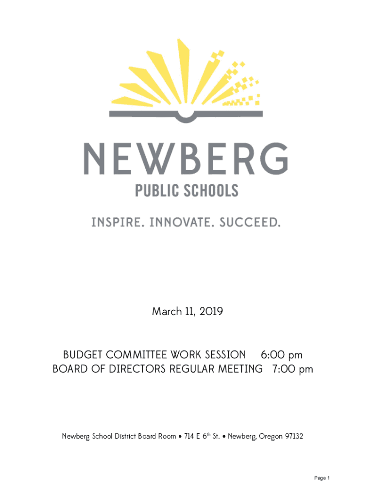 March 11, 2019BUDGET COMMITTEE WORK SESSION 6:00 pm BOARD OF DIRECTORS REGULAR MEETING 7:00 pmNewberg School District Board Room 714 E 6th St. New berg, Oregon 97132Page 1This page left intentionally