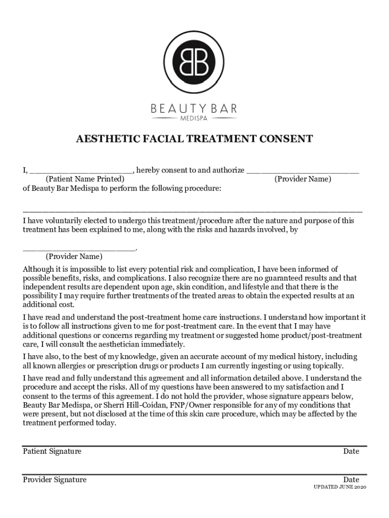Get the free AESTHETIC FACIAL TREATMENT CONSENT - Beauty Bar Medispa