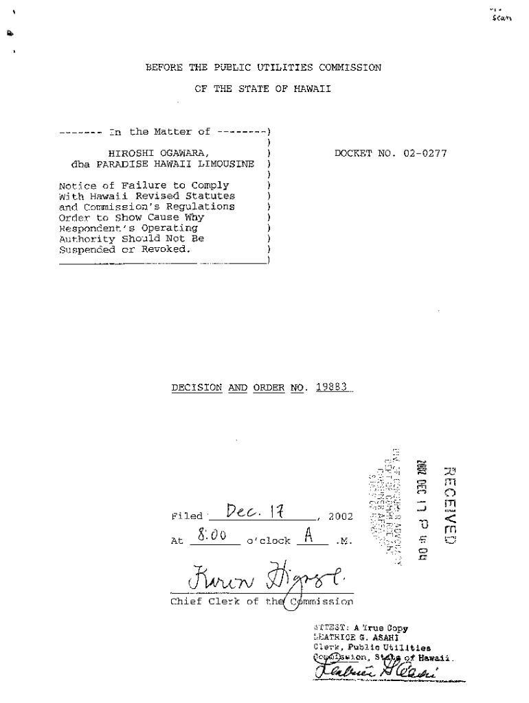 BEFORE THE PUBLIC UTILITIES COMMISSION OF THE STATE OF HAWAIIInthe MatterofHIROSHI GADARA, DBA PARADISE HAWAII LIMOUSINE)DOCKET NO. 020277Notice of Failure to Comply With Hawaii Revised Statutes and