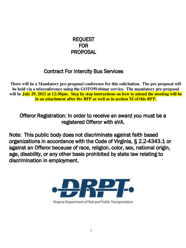 REQUEST FOR PROPOSAL Contract For Intercity Bus Services There will be a Mandatory proposal conference for this solicitation. The PRE proposal will be held via a teleconference using the GoToWebinar