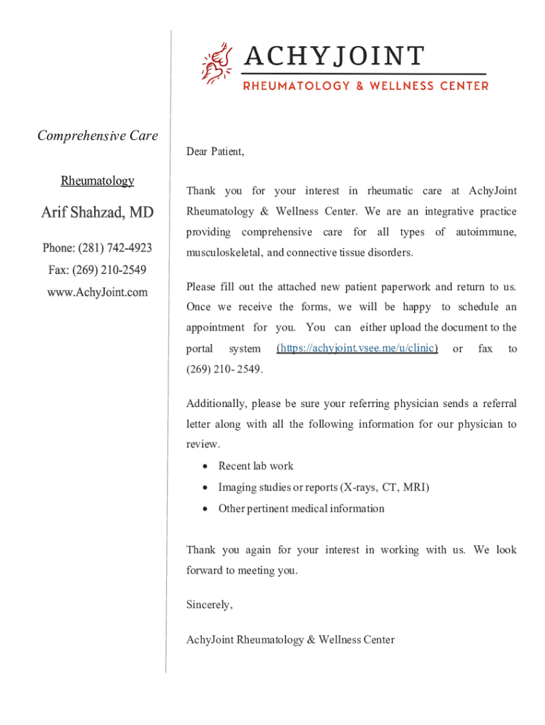 Comprehensive Care Dear Patient, RheumatologyThank you for your interest in rheumatic care at Adjoint Rheumatology & Wellness Center. We are an integrative practice providing comprehensive care for