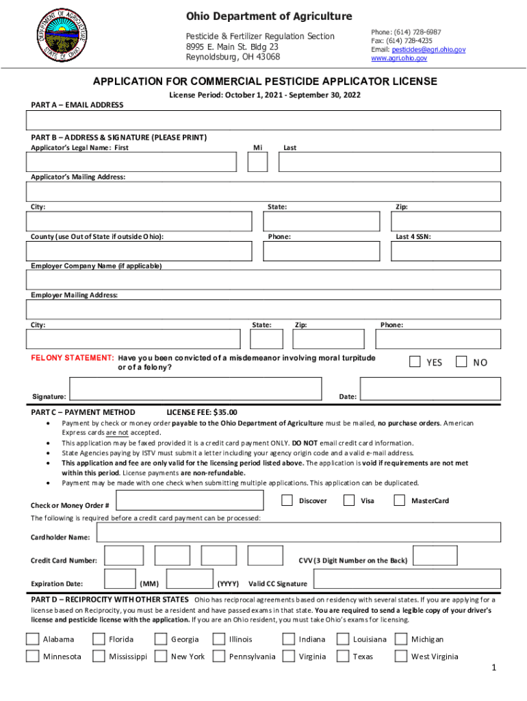 Ohio Department of Agriculture Phone: (614) 7286987 Fax: (614) 7284235 Email: pesticides Agra.Ohio.gov www.agri.ohio.govPesticide & Fertilizer Regulation Section 8995 E. Main St. Bldg 23 Reynoldsburg,