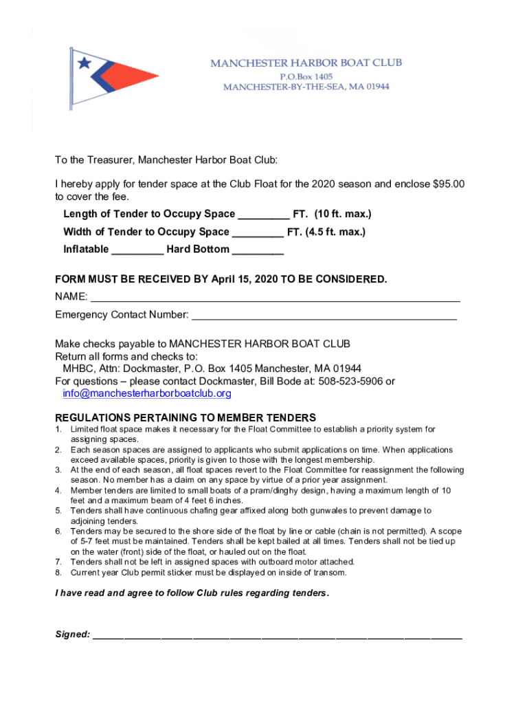 To the Treasurer, Manchester Harbor Boat Club: I hereby apply for tender space at the Club Float for the 2020 season and enclose $95.00 to cover the fee. Length of Tender to Occupy Space FT. (10 ft.