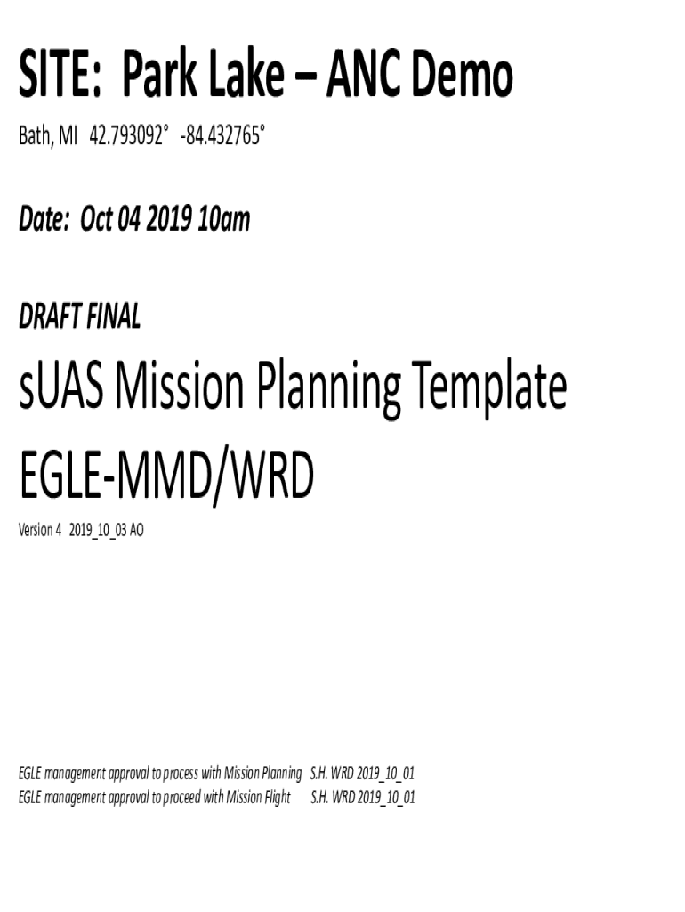 SITE: Park Lake ANC Demo Bath, MI 42.793092 84.432765Date: Oct 04 2019 10am DRAFT Finals UAS Mission Planning Template DILEMMA/WORD Version 4 2019_10_03 ANGLE management approval to process with Mission